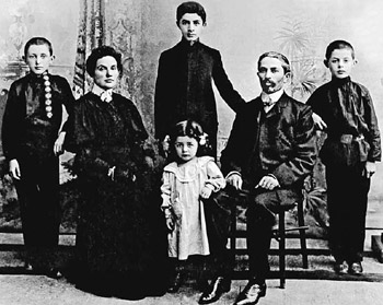 | Семья Ильи Ильфа, Одесса, 1906 год. Мать Мидль Ароновна, отец Арье Беньяминович и трое братьев: слева Мойше, в центре Сруль и маленький Вениамин, одетый, как девочка. Иехиель Файнзильберг (будущий писатель) — крайний справа |
