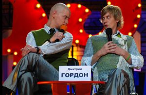 ![]() Пародия на программу «В гостях у Дмитрия Гордона»: в роли Дмитрия Гордона Евгений Кошевой, в образе Ирины Билык Сергей Казанин |