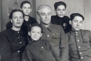 | Иосиф (на переднем плане) с мамой Идой Исааковной, отчимом Моисеем Моисеевичем Раппопортом и братьями |
