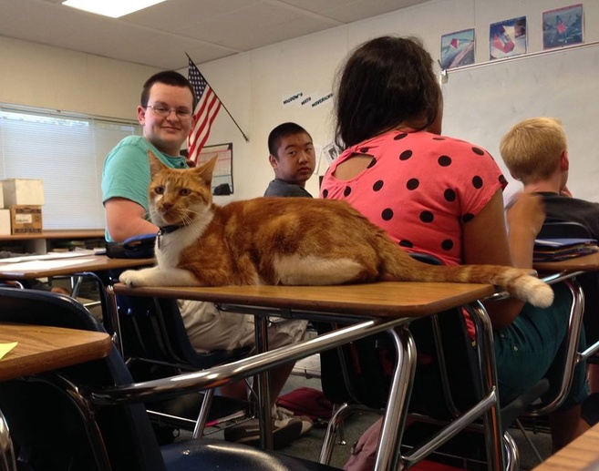 Животное не желает проводить дни на диване, как его сородичи, а ежедневно ходит на занятия в высшей школе Леланда или средней школе Брета Гарта в Сан-Хосе в Калифорнии.